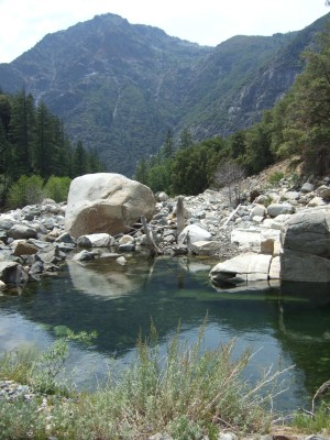 At the river this slide has resulted in beautiful bedrock pools being filled with debris from the slide. For the next .3 miles the bedrock pools are completely filled in with debris. Beyond that the pools have less debris.