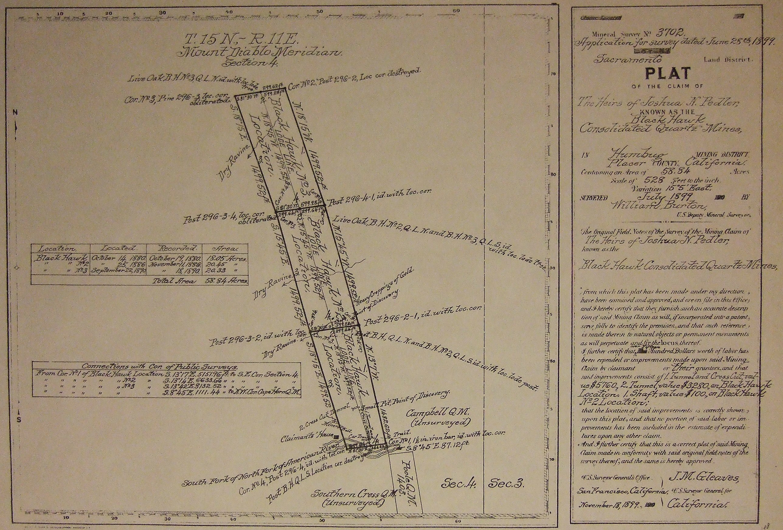 This 1899 plat of the claim, with the correct name and location, was filed along with the patent.