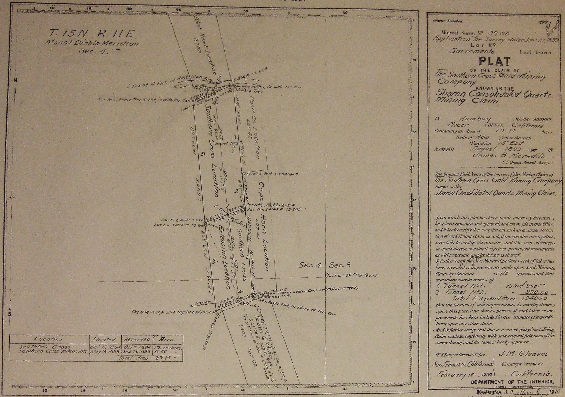 The Southern Cross claim was patented in 1901. This 1900 plat of the claim was filed along with the patent. Click for larger image (1.2MB).