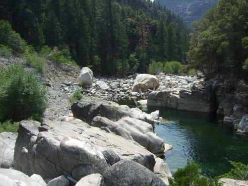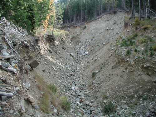 At the river this slide has resulted in beautiful bedrock pools being filled with debris from the slide. For the next .3 miles the bedrock pools are completely filled in with debris. Beyond that the pools have less debris.