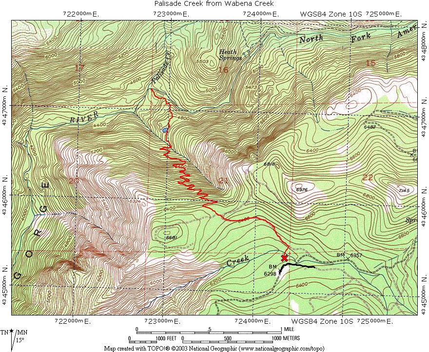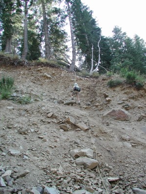 The Palisade Creek Trail from Wabena Creek is one of the few modern era trails in the North Fork. The slope that the trail was constructed on in the 1980's appears to be unstable, this may have been due to a timber harvest on this very steep slope. During the heavy January 1997 storm the ravine that the trail crosses near the bottom of the slope had a significant slide that has left a deep gully. The damaged trail has not been repaired and hikers must negotiate this obstacle to reach the river. There are ropes to help in getting up and down the sides, but use caution when crossing this gully, the sides are loose and you will knock some rocks loose.