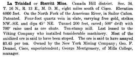 This description of the La Trinidad mine is from Mines and Mineral Resources of the Counties of El Dorado, Placer, Sacramento, Yuba (1917):